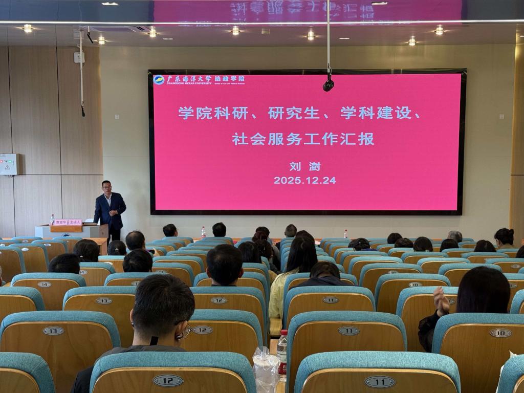 学院教学、科研及学生工作的分管领导分别进行工作总结与工作部署。分管学生工作学院党委副书记黄善总结了本学期学生思想政治教育、日常管理、就业指导等工作,部署了假期学生安全教育、社会实践、就业帮扶等重点任务,提醒全体辅导员做好假期学生动态监测与服务工作。分管教学工作副院长刘勤系统回顾了学院2025学年在教学地位巩固、教学运行管理、教研教改推进、创新创业教育及国际交流合作等方面所取得的进展与成效,通报了期中教学检查学校检查组的总体意见、主要优点及存在不足,明确了学期期末教务管理与考务组织相关工作要求,并对2026学年专业建设、智慧课程开发、实验室建设与运行管理等重点工作作出了初步部署。分管科研副院长刘澍围绕本学期核心任务展开深度总结,系统通报了各级各类科研项目结题验收情况、学术成果产出与转化成效、研究生教育教学培养、学科建设及人才引进和社会服务工作等方面;分析了学院科研发展的优势与瓶颈,指出当前存在高端学术成果偏少等问题。并提出接下来学院科研要背靠大海洋学科图发展,学科建设方面要力争设立涉海平台或机构,同时争取扩大研究生招生规模并聚集资源,将社会服务转化为科研动力。
