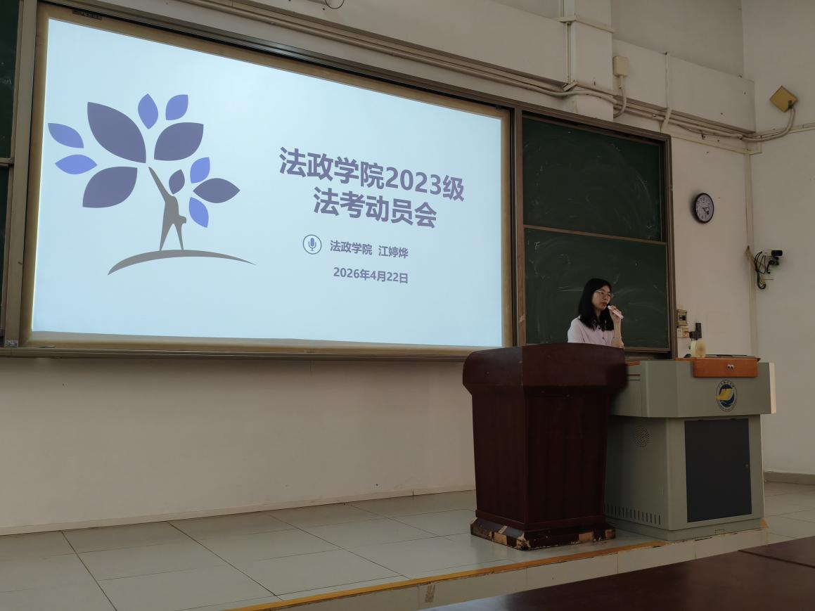 为进一步营造勤学善思、笃行致远的优良学风,全力提升法考通过率,助力毕业生高质量就业,为社会输送更多高素质法治人才,我院于2026年4月22日下午,召开2023级法学专业法考动员会暨法律实务技能卓越班开班大会。法律实务技能卓越班指导老师江婷烨博士、2023级法学专业辅导员邱日梅老师、2022级法学专业高分通过法考的蔡纯同学,以及2023级法学专业学生参加本次会议。